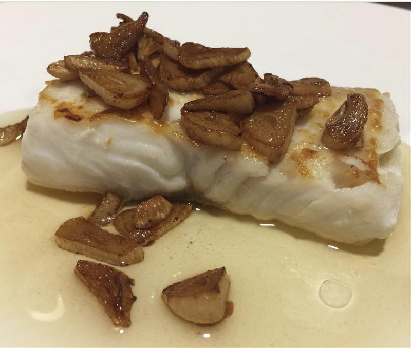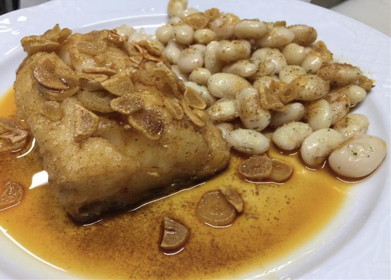 Uno de los platos más típicos de la gastronomía catalana, bacalao frito con ajo, pimentón y acompañado de las tradicionales judías blancas salteadas. ¡Delicioso!